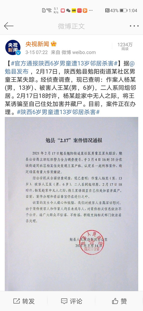 据@勉县发布 ,2月17日,陕西勉县勉阳街道某社区男童王某失踪。经侦查调查,现已查明:作案人杨某(男,13岁)、被害人王某(男,6岁),二人系同组邻居。2月17日18时许,杨某趁家中无人之际,将王某诱骗至自己住处加害并藏尸。目前,案件正在办理。#陕西6岁男童遭13岁邻居杀害#