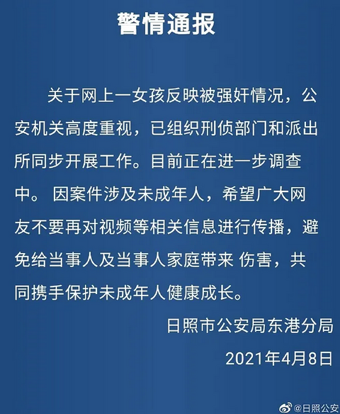 4月7日,山东日照“一名13岁女生自述遭强奸”的视频在网络上流传。 7日晚,记者联系到当事女生安某,她表示,视频所说内容属实。事发后,她已经辍学,住在“干姐姐”卢女士的家中。目前,她已在“干姐姐”的陪同下前往当地派出所报案。 4月8日,日照市公安局发布通报称,已组织刑侦部门和派出所同步开展工作,目前正在进一步调查中。 安某父亲提到,安某系2008年出生,今年确实是13岁。此前曾有人拿了10万给安某