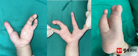 转自新晚报 虽然给数百例畸形的手脚 做过矫形手术 但医生还是被 眼前的一幕惊呆了 一岁半的孩子,手脚指有的从虎口分叉,有的从手指中间分叉,有三根的,有四根的,像龙虾的钳子,这在国内发生率仅为1.0/10000的患儿让他遇见了。 分裂手(足)畸形,这是医学上给这个女宝宝所患病的名称。孩子虽然已经一岁半了,但体重只有7公斤,存在明显发育迟缓的情况。