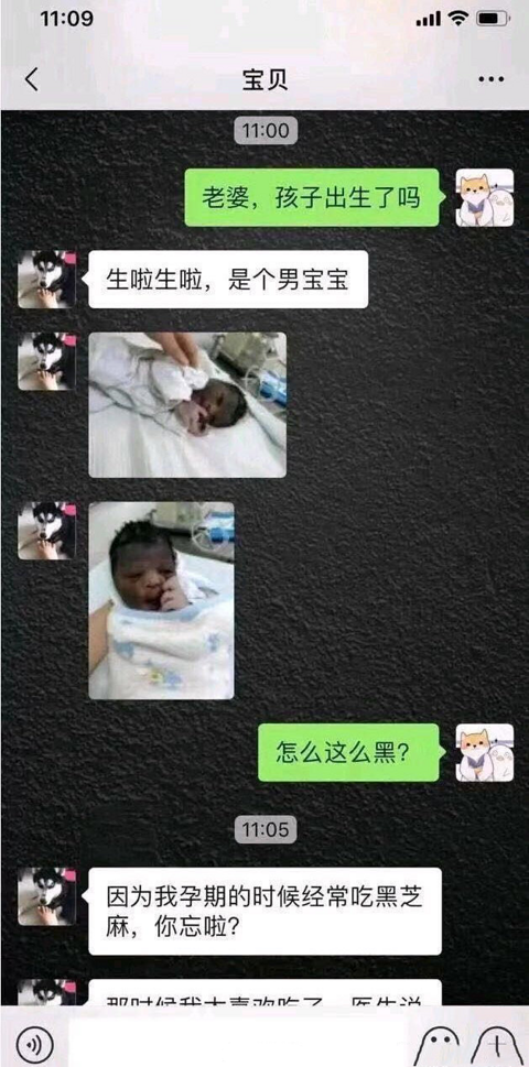 昨天老公跟我说孕期黑芝麻吃多了孩子容易变黑,是这样吗?本来我就不信,但他给我看的这个聊天记录真的把我笑到了,这也太黑了吧,像个非洲孩子!我也不知道他从哪里看到的,把图片保存了给大家分享看看: