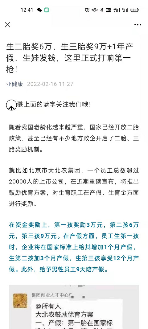 企业开始催生啦!围观这个单位,好给力,生二胎奖6万,生三胎奖9万+1年产假。直接发钱,单位还是很给力。一般能做出这种决定的企业,企业员工应该本身收入也不错。发钱锦上添花,还是不错。
