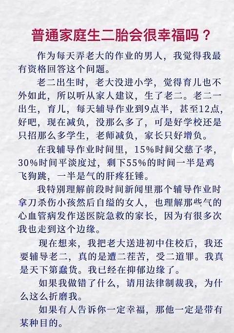 现在提倡生二胎,三胎,但普通家庭生二胎真的好吗?一个宝爸听从老人的建议要了二胎,却后悔不跌。通过他的辛酸经历,可能你生二胎的想法会发生改变。
