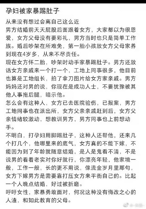 孕妇被老公家暴踢肚子,还放话女方亲戚来一个打一个……看到这个真的太生气了,妹子们真的要远离家暴男,连孕妇都要打的男人都不配叫男人了,说狗都侮辱狗了,简直就是个人渣。