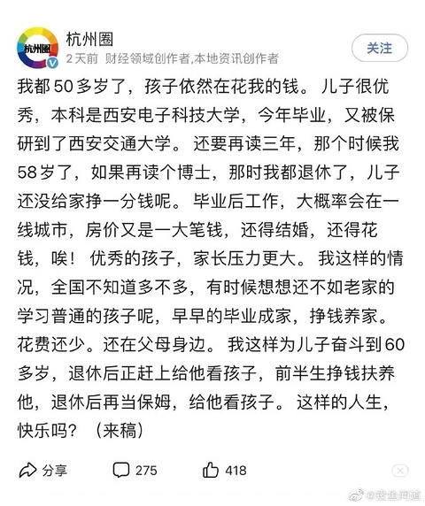 看到网上两个故事,一是父母来信,说孩子上硕士博士,自己退休了,孩子还在上学。这个还算条件好的,很多农村孩子父母,没有退休,一直在奋斗,压力更大。另一个故事是说,孩子在北京上大学,父母是老师,为了孩子在北京成家,卖了老家房子,双双去北京做保洁,给儿子凑钱。现代科技太复杂,人的培养教育周期太长,父母投入产出比太低,农耕水十来岁就能放牛带孩子做饭,现在要到接近30岁毕业。加上毕业后,还要帮忙买房子带孩子
