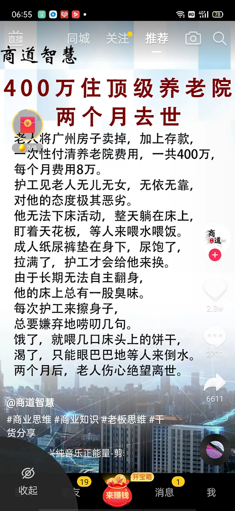 在广州有个老人无儿无女,无依无靠,他卖掉了广州房子,住进了养老院。每月护理费花8万,一共付了400万。花掉了所有的存款和卖房子的钱,也没得到好的护理,结果2个月后,老人伤心绝望地离世了。 这里我还是想奉劝那些想独身主义的青年才俊们、那些个高傲的单身男女们一句,结婚养个孩子吧!即使累点苦点那也是累并快乐着,也不会像这个老人那样老无所依,任人欺凌。待自己老了也有个人端个茶送个水,就是不在身边,自己也有