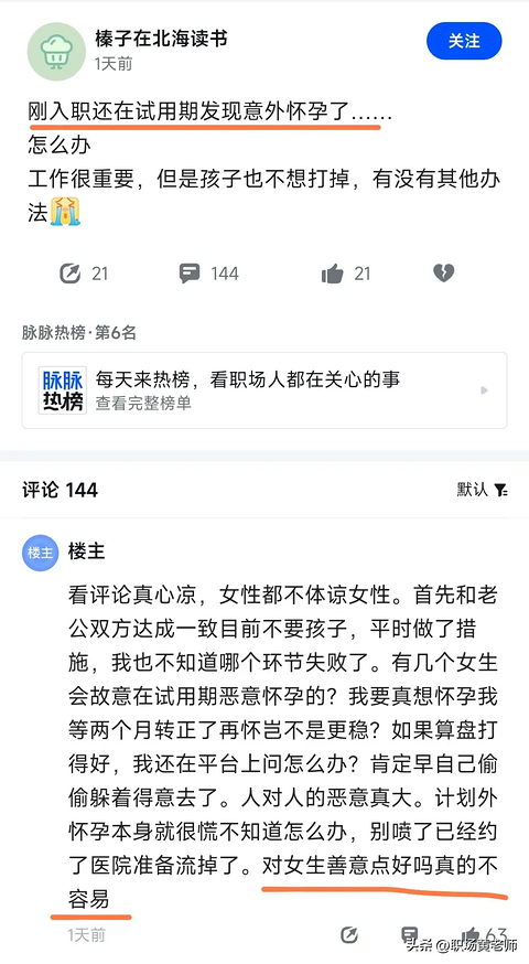某女员工说:还在试用期,发现自己怀孕了怎么办?到底是保工作还是保孩子?思考:当然100%的是选择保孩子呀!正如评论区有人所言,和孩子比起来,工作一文不值。你可以选择正常上班,正常生娃,正常请假,孕期单位是不能够非法辞退孕妇的。什么时候开始,职场上的女员工怀孕竟然成了一种原罪?这还是在国家大力鼓励生育的背景下。