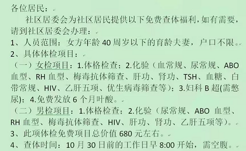 看到有妈妈在说收到了小区群发送的免费体检通知,但是仔细阅读——原来是妥妥的催生三胎。 通知中:人群限定为“女方年龄40周岁以下的育龄夫妻”,也就是说只要女性年龄不高于40岁,男性50~60均可,女性体检项目限定为妇科项目,男性体检项目基本就是常规化验。体检还免费发放6个月的叶酸。 这不就是赤裸裸的催生二胎三胎么。