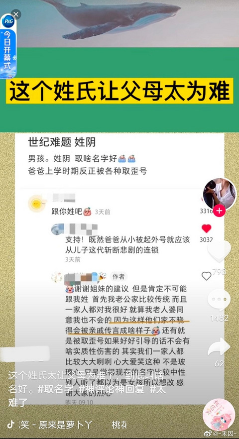 姓阴,我想了20分钟都没想到有什么好的名字。是我的话,估计就让孩子直接跟着我姓了。不然以后孩子因为名字要一直被嘲笑被取外号,真的太委屈了。