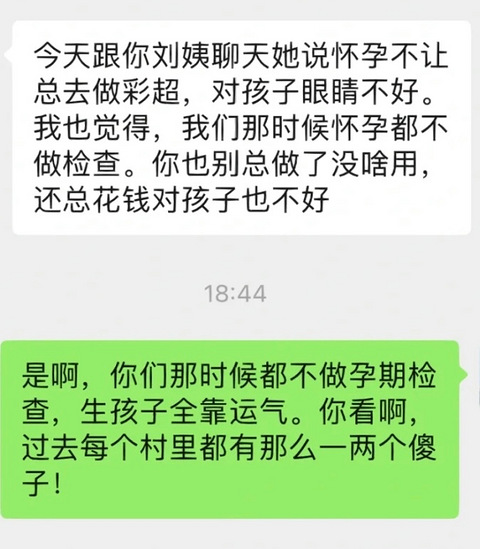 网上看到的,婆婆让怀孕的媳妇不要总去产检做彩超,说对孩子眼睛不好,其实是怕花钱吧。这波回怼很遛!提前那是没条件,有条件谁不想踏踏实实生个健康的孩子。