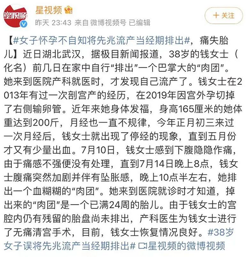 “在家流产后我才知道自己已经怀孕24周。”近日一则热搜新闻引发网友热议,内容是:女子怀孕不自知,把先兆流产误以为是经期。湖北武汉的38岁钱女士,前几日在家中突然排出一个巴掌大的“肉团”。她去到医院就诊,才发现自己是流产了,排出的“肉团”竟是一个已满24周的胎儿。 据了解,钱女士在2013年有过一次剖宫产,在2019年因宫外孕切掉了右侧输卵管。近年来她身体发福,身高165厘米的她体重达到200斤,月