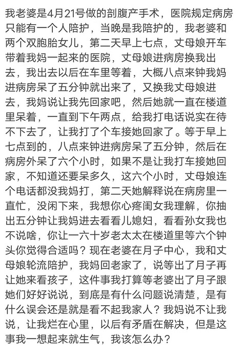大家来看一下这个故事,我多少觉得这个男子有点矫情了。 生过孩子的都知道其实照顾产妇和孩子确实挺忙的,而且这里还是双胞胎,更忙。这个哭完那个哭,要换尿不湿要喂奶,哭了还得抱着哄,还要照料产妇。说忙得脚不沾地都不为过。 还要让丈母娘去面面俱到地考虑亲家的心情,把亲家换进来看一下孙女。这确实容易忽略的。而且怎么换呢?这个娃正在哭,打电话说亲家换你来吧。那么婆婆心里也许会更不高兴吧,怎么不把娃哄妥帖了再换