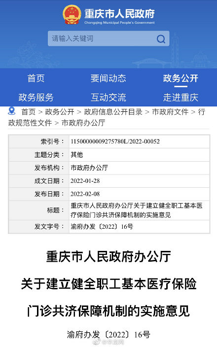 2月8日,重庆市人民政府办公厅发布《重庆市人民政府办公厅关于建立健全职工基本医疗保险门诊共济保障机制的实施意见》。明确在2023年年底前,重庆全面建立职工医保普通门诊统筹制度,将普通门诊医疗费用纳入医保基金支付范围,实现医保个人账户能给配偶、父母、子女使用。 来源: 华龙网