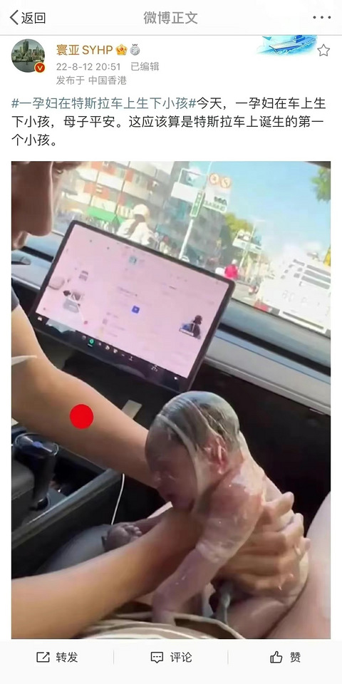 "香港特斯拉车里竟然降生了一个小孩"8月12日,一孕妇在特斯拉车上生下小孩,母子平安。这应该算是特斯拉全球第一个例吧。只能说歪国人真的牛批,竟然知道怎么接生。