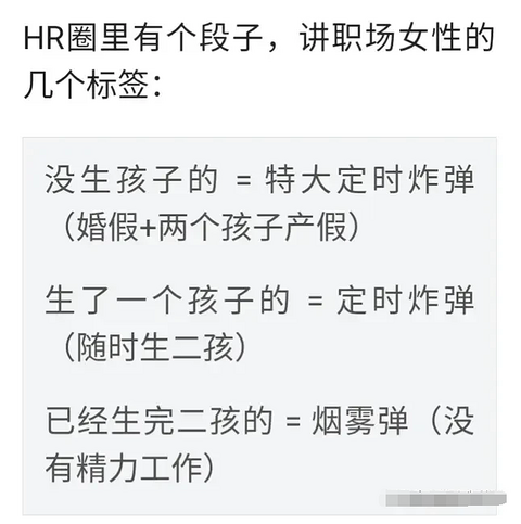 下面是HR圈子流传的段子,讲述职场女性的心酸与无奈,这也是为啥女性在职场里往往处于弱势,不受私人企业待见的一方。。。 我记得前几年在应聘的时候,也受到不少HR的质疑,27岁,你打算什么结婚,生孩子,哪怕你说目前没有打算,他们很大可能不会考虑你。。。这就是人性,因为他们是私人企业,需要自负盈亏的,每个人角度不同,无所谓对与错!