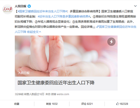 【#国家卫健委回应近年来出生人口下降#:多重因素综合影响结果】国家卫生健康委人口家庭司副司长杨金瑞:#近年出生人口下降是多重因素影响结果#。①育龄妇女特别是生育旺盛期育龄妇女规模下降;②年轻人婚育观念显著变化;③生育养育教育成本偏高加重了生育顾虑;此外,新冠肺炎疫情也对部分群众婚育安排产生一定影响。