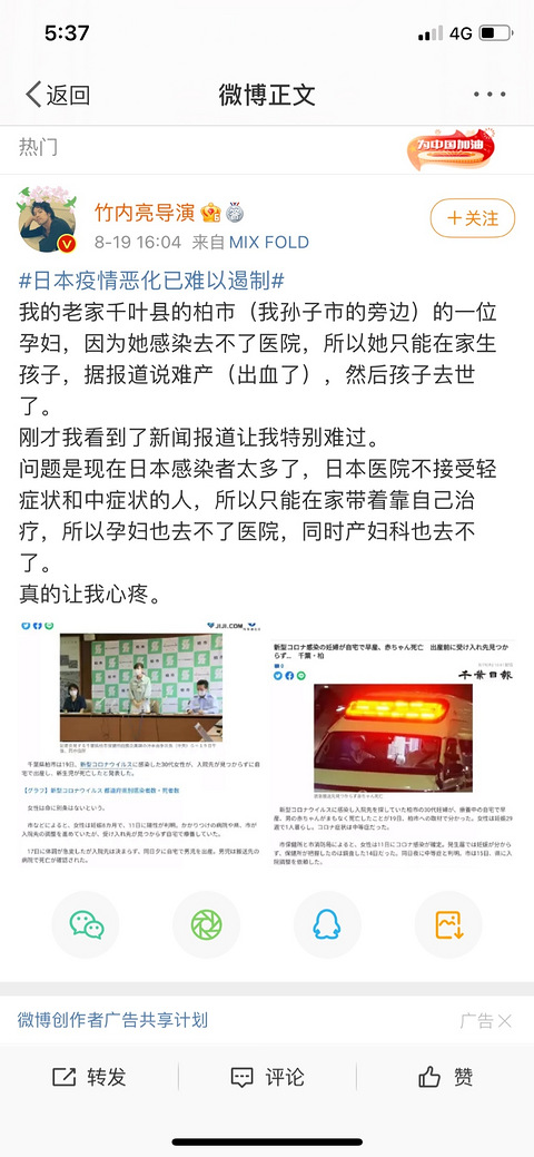 刚刷微博看到的,还是一个导演发的。一位孕妇,因为她感染去不了医院,所以她只能在家生孩子,据报道说难产(出血了),然后孩子去世了。现在日本感染者太多了,日本医院不接受轻症状和中症状的人,所以只能在家带着靠自己治疗,所以孕妇也去不了医院,同时产妇科也去不了。太可怜了。
