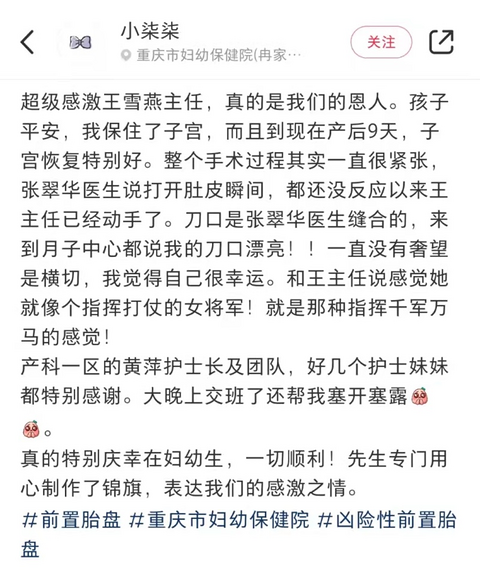 转自上游新闻 “重庆市妇幼保健院产科专家团队值得信赖,不仅让我们母女平安,还保住了我的子宫……”近日,王女士在重庆市妇幼保健院多学科医疗专家团队通力协作下,顺利完成危重凶险性中央性前置胎盘手术。 王女士在社交平台对医院科室表达感谢 出院时,王女士一家人抱着出生不久的宝宝,将印有“化危重凶险,保母女平安”等字样的三面锦旗赠予了产一科医护团队,以此表达她的感激之情。 三面锦旗赠予产一科医护团队