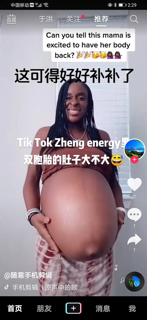 刷抖音刷到的怀孕的妈妈肚子,有种要爆了的感觉,还是第一次看到这么大的肚子,女人可真是不容易,肚子撑那么大,估计是生完宝宝以后很难恢复的。