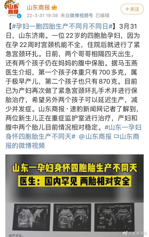 山东一孕妇身怀四胞胎,先生了两个,还有两个留在肚子里继续胞胎。评论里一堆称颂和自我感动的。我看有医生分析下,大概率促排怀4胎+宫颈口机能不全+孕25周娩出700g胎儿+几天后又娩出800g胎儿+其余两胎还在保胎中…生殖遗传的医生表示:真的看不出这有什么歌颂的,大人惨+孩子遭罪(即使能存活一堆并发症等着)+社会资源耗费。正确理智做法是什么?孕早期发现四胞胎就该减胎。22岁怀孕,是被家里逼着生男孩所以