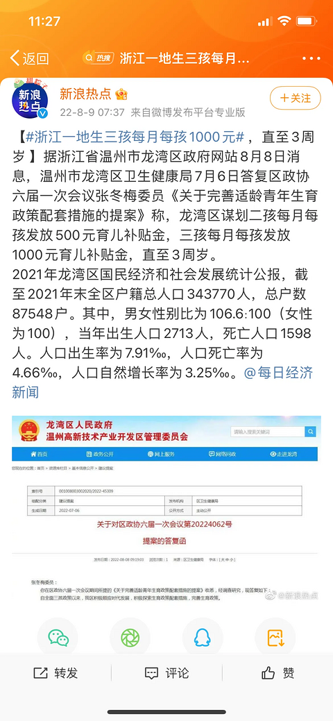 为了鼓励三胎,浙江温州想出来“一家生娃,每月每孩1000元”