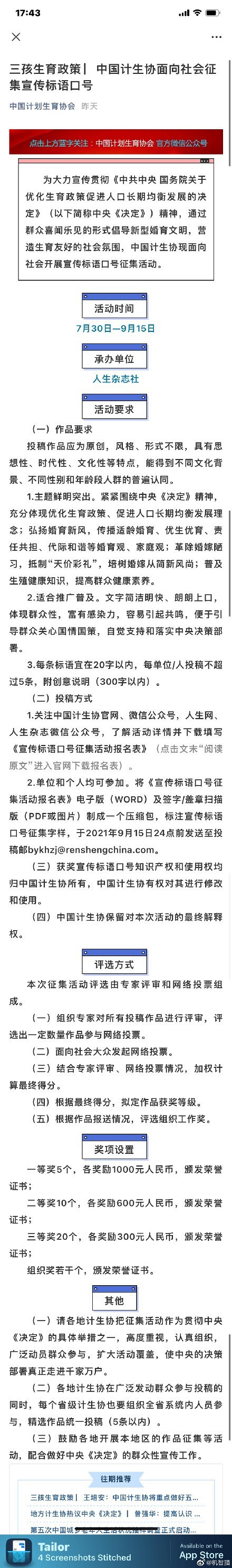 中国计划生育协会官网日前发布通知指出,为大力宣传贯彻《中共中央 国务院关于优化生育政策促进人口长期均衡发展的决定》精神,通过群众喜闻乐见的形式倡导新型婚育文明,营造生育友好的社会氛围,中国计生协决定面向社会开展宣传标语口号征集活动。活动时间(7月30日—9月15日)活动共设置一等奖5个,各奖励1000元人民币,颁发荣誉证书;二等奖10个,各奖励600元人民币,颁发荣誉证书;三等奖20个,各奖励30