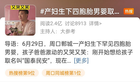 昨天我才看到一个四胞胎的,也发了帖子分享,结果今天又看到四胞胎上了热搜[ej=1F602][ej=1F602]。只是不同的是这个前面已经有两个女儿了,而且四胞胎还取名繁荣昌盛,真是厉害了我的爸爸[ej=1F602][ej=1F602]