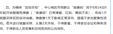官方消息出了:明起重庆中心城区市民健康码全部转“橙码”完成一次核酸采样后自动消窗。才生了宝宝的在医院做都还好,坐月子的妈妈些怎么办也?未必这么热的天还要跑出去排队做核酸啊?好恼火哦。 今天(8月23日),重庆市召开第117场疫情防控新闻发布会,介绍疫情防控最新情况。重庆市政府副秘书长、新闻发言人杨琳介绍,24日0时起, 重庆中心城区范围内市民健康码全部转“橙码”,在完成一次核酸采样后自动消窗,弹窗