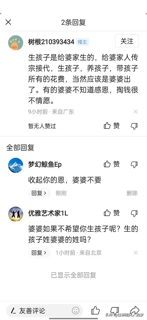 生孩子是给婆家生的,给婆家人传宗接代,生孩子,养孩子,带孩子的所有花费,当然应该婆婆出了。有的婆婆不懂感恩,掏钱很不情愿。 这是这个网友说的。 我真是不明白了呀,这位网友如果是女的,那你生的儿子不是叫你妈妈吗?老了以后不是给你养老吗?如果是男的,那我想问你,你给你爷爷奶奶养老吗?你家里都是孙子给爷爷奶奶养老的吗? 难道现在都是流行孙子养老,不是儿女养老吗?何况现在好多儿女都靠不住,还能指望孙子?