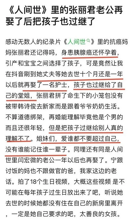 这是《人世间》里的一个真实的故事,张丽君怀孕五个月的时候被检查出胰腺癌,因为怕自己离开后丈夫一个人孤单所以拒绝了引产,中断治疗,拼死生下了一个早产儿。孩子出生后没多久她就去世了。而她的丈夫在她去世后不到一年就再婚了,孩子好像也给外公外婆养了。 所以说女生真的应该首先爱自己,把自我放在第一位,不要以为自我牺牲能感动任何人,尤其是男人。