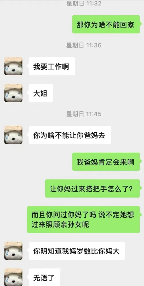 网上的一个投稿。 投稿,我和老公去年年底结的婚,怀孕之后我就辞掉了原来的工作,住在我爸妈家里(他平时工作忙,根本照顾不了一个孕妇)。某天我在同城宝妈群里看到大家在聊产后恢复,我就问我老公,能不能让他妈妈从老家来过来照顾我,我老公不同意,说他妈妈年纪大了不想让她受累。。。 (投稿人和老公的聊天记录)