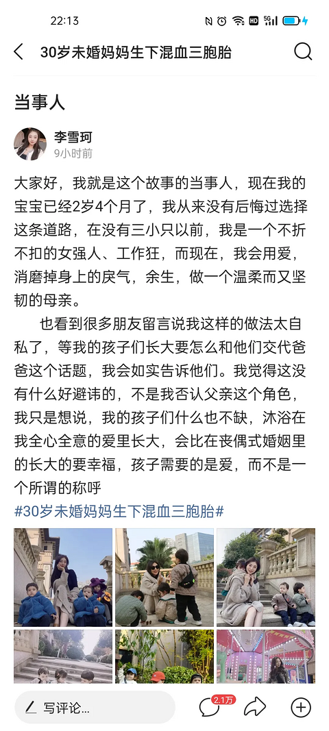 这是我昨天看到的一个新闻,受父母婚姻的影响,30岁未婚妈妈自己做试管婴儿生下混血三胞胎,太有勇气了!独自抚养三个孩子,也响应了国家三胎政策。想来她也是经过深思熟虑的,毕竟生养孩子不是一件容易的事情。