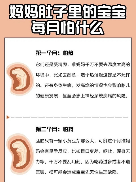 孕期妈妈肚子里的宝宝每月怕什么?当了妈妈之后,又幸福有难熬,孕期十个月对干妈妈来说并不轻松,很多人都关心孕妈,什么事情都要注意一些,但是宝宝孕期在妈妈肚子的一个月也是尤为重要的,这一期我们来看看每月宝宝怕什么,妈妈要注意哪些?