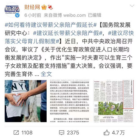 这个建议非常棒!男的7天陪产假真的太少了,一个月还是很不错的,期待尽快落实! 【国务院发展研究中心:#建议延长带薪父亲陪产假#,#建议尽快落实父母育儿假制度#】近日,中共中央政治局召开会议,审议了《关于优化生育政策促进人口长期均衡发展的决定》,作出“实施一对夫妻可以生育三个子女政策及配套支持措施”重大决策。会议强调,要完善生育休假与生育保险制度,这对于促进三孩生育政策更好落地有重要意义。