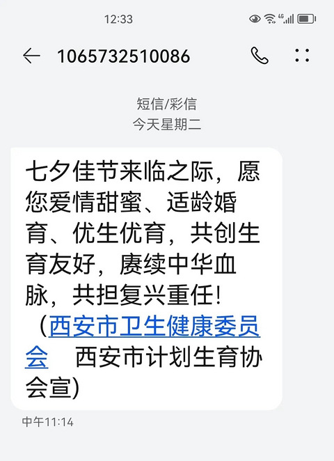 西安卫健委七夕情人节发催生短信,50岁大爷都收到了