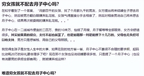 事件的主人公是个月薪仅4000元的女孩,与月薪9000元的男友谈婚论嫁时,她提出将来生孩子想去月子中心,结果对方嫌她乱花钱。 一气之下她跟男友提出了分手,并开始相亲,当相亲对象听到她提出产后要去月子中心时,也同样拒绝了她。 女孩百思不得其解:生孩子是人生中的大事,而便宜的月子中心不过三四万块钱,家里再穷挤出这点钱也不是做不到吧?难道因为穷,生孩子就不配去月子中心吗?