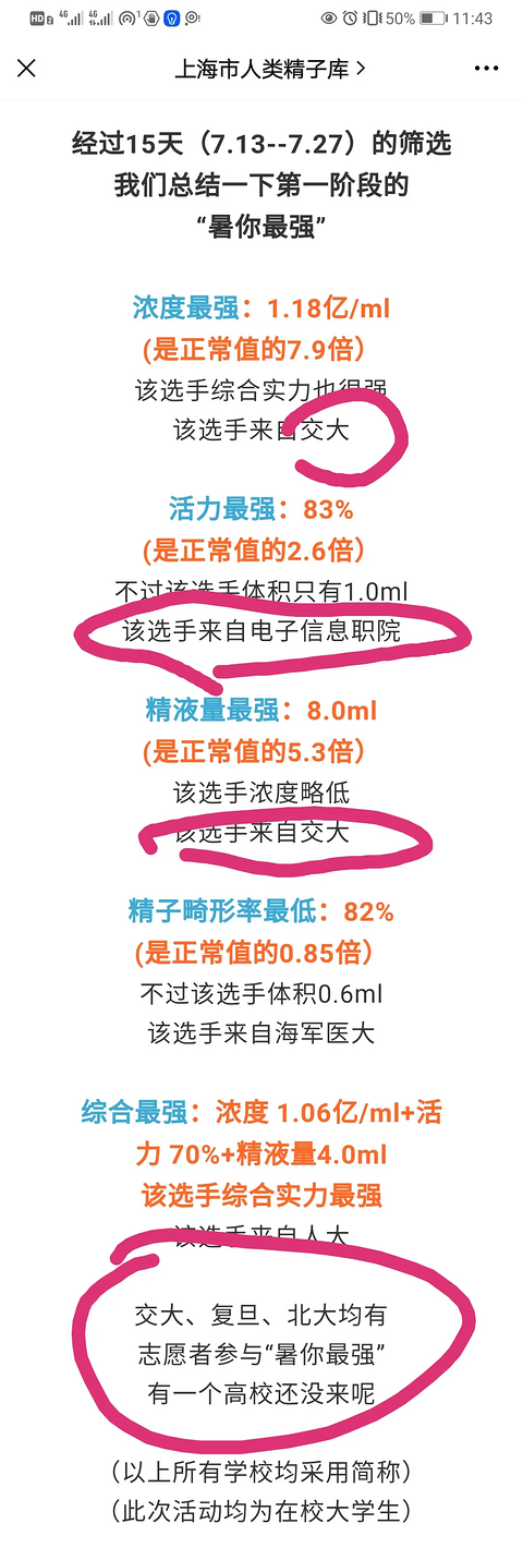 不仅仅是在东京奥运会勇夺四金,排列全世界各国第十。上海交大学子们在这个领域也是勇夺冠军!这个赛事就是…… 上海市人类精子库举办的,邀请上海大学生免费进行体检,“精子大比拼”是按精子浓度、活力、精液量、畸形率等指标进行评比。经过15天(7.13--7.27)的筛选,主办方得出第一阶段的“暑你最强”浓度冠军,该选手来自【上海交大电院】,浓度为1.18亿/ml (是正常值的7.9倍)。 综合最强的冠军也