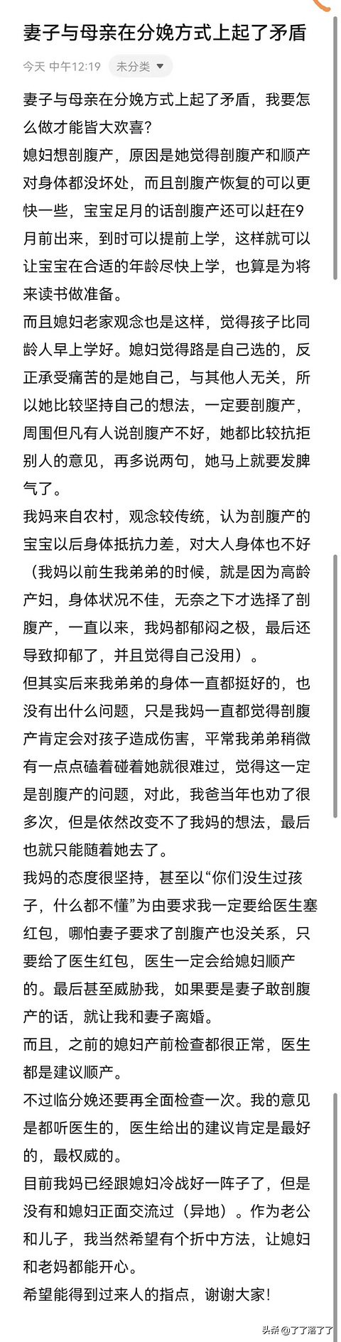 妻子和母亲在分娩方式上起了冲突,两个人谁也不让着谁,我该怎么办?请问有没有折中的办法,让她俩心平气和地商量一下。媳妇儿的想法是一定要剖腹产,到时候可以让孩子在合适的年龄尽快上学。老妈的想法是一定要顺产,到时候孩子的身体会更加健康。现在两个人因为这个事情闹得不可开交,冷战了很久了,我从中调和也没有起到半点作用。各位,请问你们有什么办法吗? (图源网络,侵删)