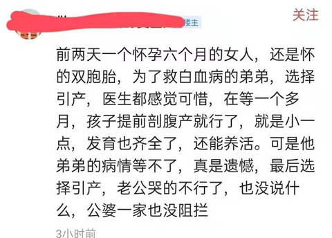 昨天看到一则网友留言,让人心痛不已。一个6个月的女人,选择引产自己的孩子,放弃健康的双胞胎。对此准爸爸哭得不行了,医生也觉得非常可惜。因为再等一个多月,孩子就能剖腹产了。哪怕小一点发育也齐全了,能够抚养成活。可是孕妈妈还是引产了,因为她弟弟得了白血病,病情等不得,她要去救弟弟。没有什么,比妈妈放弃健康的孩子,更能刺痛人心,更何况是双胞胎。太可惜了。