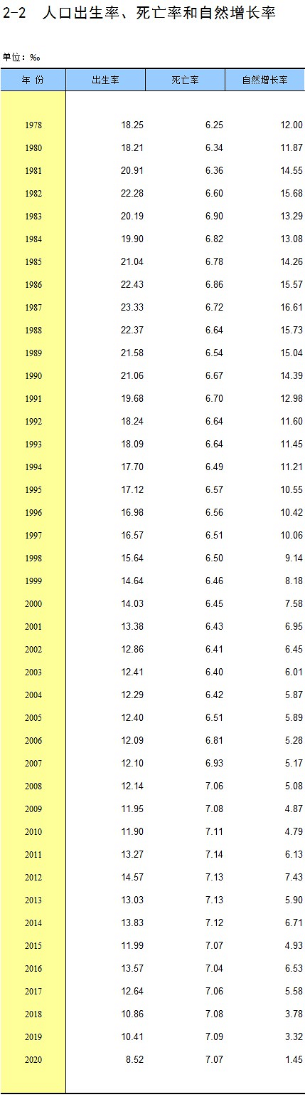 第一财经 在疫情影响下,我国出生人口数量和出生率也大幅走低。近日发布的《中国统计年鉴2021》显示,2020年全国人口出生率为8.52‰,首次跌破10‰,创下了1978来的新低。同期全国人口自然增长率(出生率-死亡率)仅为1.45‰,同样创下1978年以来的历史新低。 图片来源:《中国统计年鉴2021》