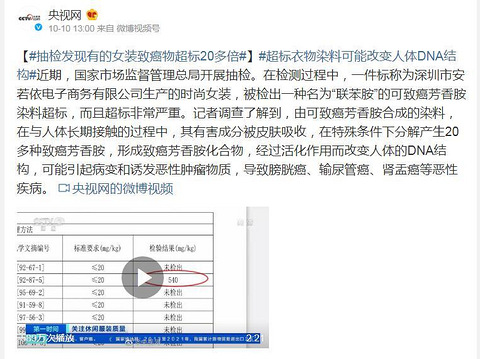 一种名为“联苯胺”的可致癌芳香胺染料超标,而且超标非常严重。记者调查了解到,由可致癌芳香胺合成的染料,在与人体长期接触的过程中,其有害成分被皮肤吸收,在特殊条件下分解产生20多种致癌芳香胺,形成致癌芳香胺化合物,经过活化作用而改变人体的DNA结构,可能引起病变和诱发恶性肿瘤物质,导致膀胱癌、输尿管癌、肾盂癌等恶性疾病。 刚刚刷wb看见的,感觉合格证还是很有必要的…姐妹们小心 抽检的是有合格证的B