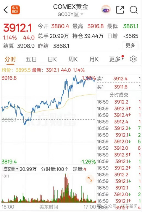 转自第一眼新闻 据财联社10月4日消息,COMEX黄金期货收涨1.14%,报3912.1美元/盎司,本周累计上涨3.23%;COMEX白银期货收涨3.45%,报47.97美元/盎司,本周累计上涨3.46%。
