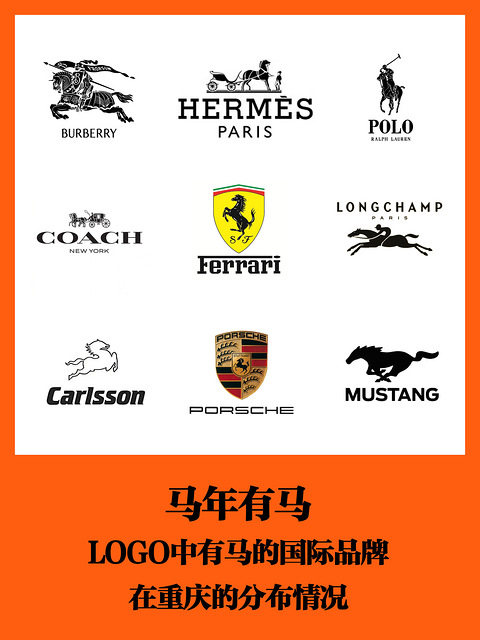 品牌LOGO中带马形象的国际品牌有:HERMES爱马仕、BURBERRY博柏利、RALPH LAUREN拉夫劳伦旗下POLO RALPH LAUREN和RALPH LAUREN童装、LONGCHAMP龙骧、COACH蔻驰、FERRARI法拉利、PORSCHE保时捷、CARLSSON卡尔森、MUSTANG野马。 品牌中文名中带马或玛的品牌有:MAISON MARGIELA梅森马吉拉、MARNI玛尼