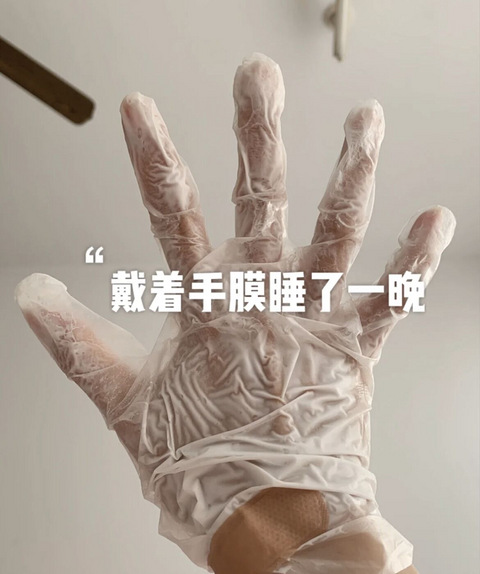 把手膜戴了整夜,为了防止睡觉乱动搞掉手套我还用了失传的创可贴大法,果真不错哎!