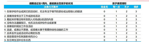 注意力不集中?忘东忘西? 有可能是ADHD导致的! 第1-9条代表注意力不集中的常见症状将1-9条的分数加起来,除以9,若得分>1,提示有注意缺陷风险,建议到专业医院机构就诊。