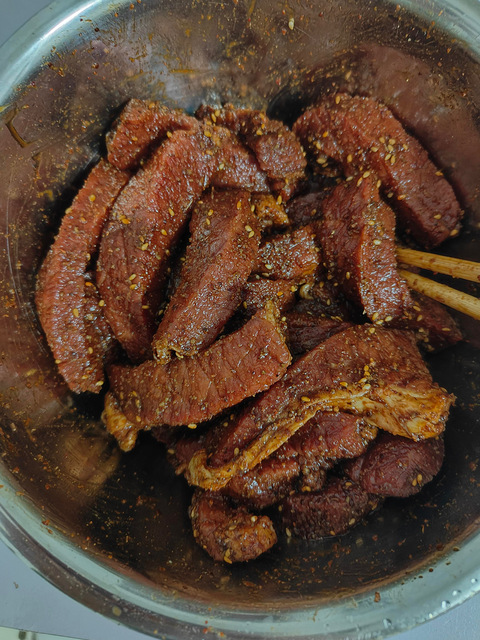 做法:牛肉切条,泡两个小时血水,稍微晾干,放入烧烤料,孜然粉或者孜然粒,生抽,老抽,蚝油,少许胡椒粉和十三香,喜欢咸一点可以放一点盐,放冰箱放置一晚上,第二天拿出来空气炸锅烤干到没有水,温度不要太高,160左右,中途记得翻面,太美味了。