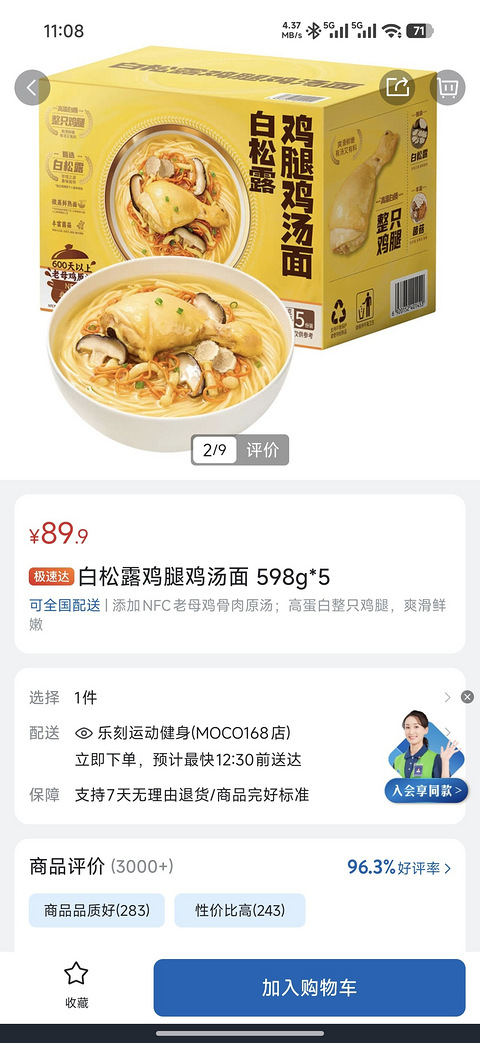 白松露鸡腿鸡汤面一盒5份89.9,合18一份
