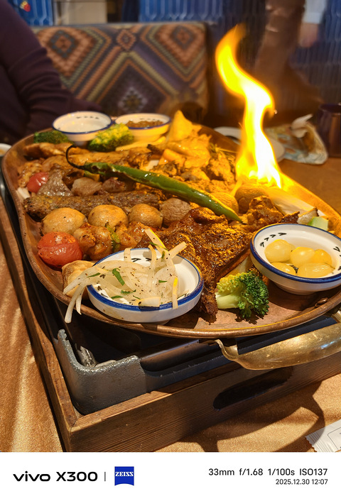 有的人拍出来的照片就是好看很多很多呀[/11鼓掌][/11鼓掌][/11鼓掌]很喜欢这种直接盗图用烤肉拼盘 里面有鸡肉牛肉羊肉蘑菇西兰花番茄饼 饼里面有土豆和胡萝卜 配菜是洋葱 酸奶 辣椒右下角的也是辣椒 有点点辣 但是我觉得吃肉时小小的吃一点这个辣椒很爽好吧 说回味道 吃完就忘 没有说一定要再吃一口的意思 但是服务太态度是极好的 小伙伴想吃里面的白水煮西兰花 给他单独上了两碗 单独的西