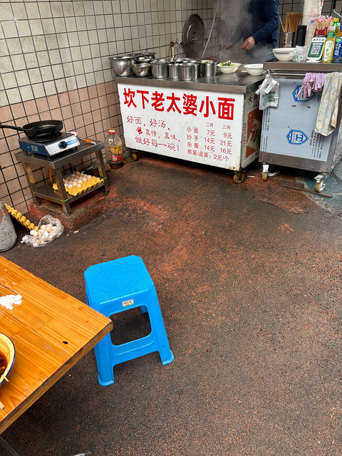 盘溪坎下老太婆小面,今日份碳水快乐。紧赶慢赶1点关门,吃到了是老重庆小面的味道!就是没得遮挡,这个天还好,还暖和点可以再来吃,冷很了就不敢来吃了,好冷!看佐料也是稳当了,老重庆小面的做法,有猪油的小面,还有清汤不放盐巴的做法都是老重庆小面的做法!花椒有点麻!值得二刷!