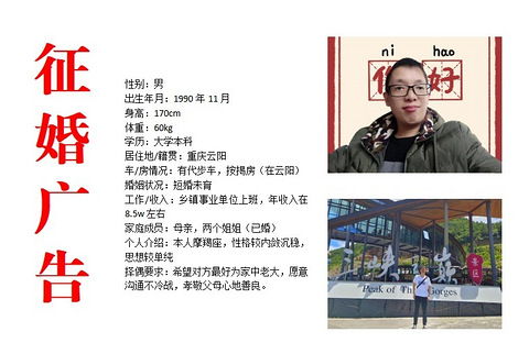 83年,173,未婚,大专,老家重庆区县的,微胖,回兴购房,代步车,收入扣了五险一金8000以上,公积金2000,老家区县的农村的,工作外资企业做技术员员,长相普通的人,不抽烟,不喝酒,不赌博,基本是是两点一线,喜欢爬山,长期活动渝北回兴这边的。寻觅一个真心实意过日子的人,未婚离异均可,不能带娃儿,对身高没得要求,对物质没得要求,长相普普通通,对人真诚,大家一起努力,共同创造一个美好的生活
