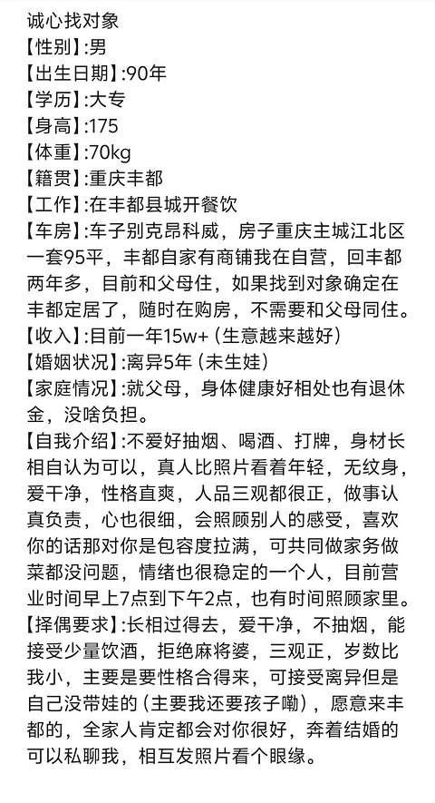 Hi 本人丁克,看不惯划走,喷子勿扰。有娃(不论娃跟谁)或者有大面积纹身勿扰,骗子和约P的勿扰。资料真实有效,照片有美颜随意看看就行。私信的同学直接发个自我介绍呗,纯打招呼不回复哈。 年纪:87年巨蟹,身体健康婚否:离异未孕(婚史一年)学历:211本科净身高:155(有体检报告) 工作:外企,双休,有正常节假日和年休假。家乡及家庭:北方人,独生女,父母有退休金,现在跟我一起生活在重庆。经济情况:公
